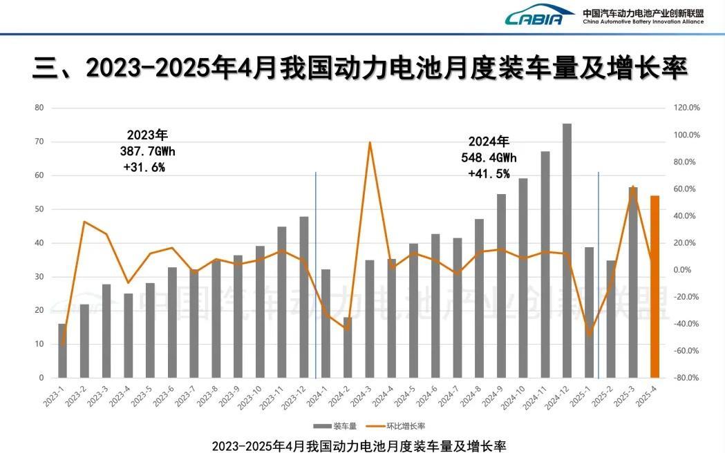 2025年4月,中国动力电池市场在高速增长中暗流涌动。根据中国汽车动力电池产业创新联盟近日公布的数据,4月国内动力电池装车量达54.1 GWh,同比猛增52.8%。